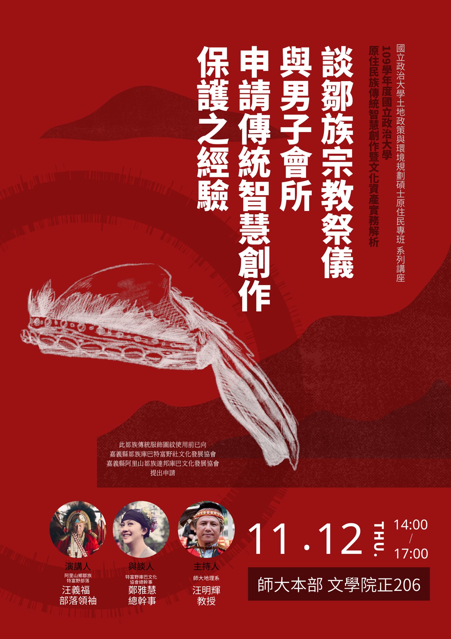 首場講座我們舊邀請到了重量級的嘉賓,是來自阿里山鄉特富野社的部落領袖-汪義福部落領袖來擔任我們系列講座第一場次的演講者,並邀請到了特富野庫巴文化協會的總幹事-鄭雅惠總幹事擔任與談人,來與我們談談鄒族特富野部落的傳統文化創作經驗,甚至邀請到了國立台灣師範大學地理學系教授-汪明輝教授擔任主持人,還請大家注意本次活動地點為【師大本部】喔,心動的朋友小心不要跑錯地點了!