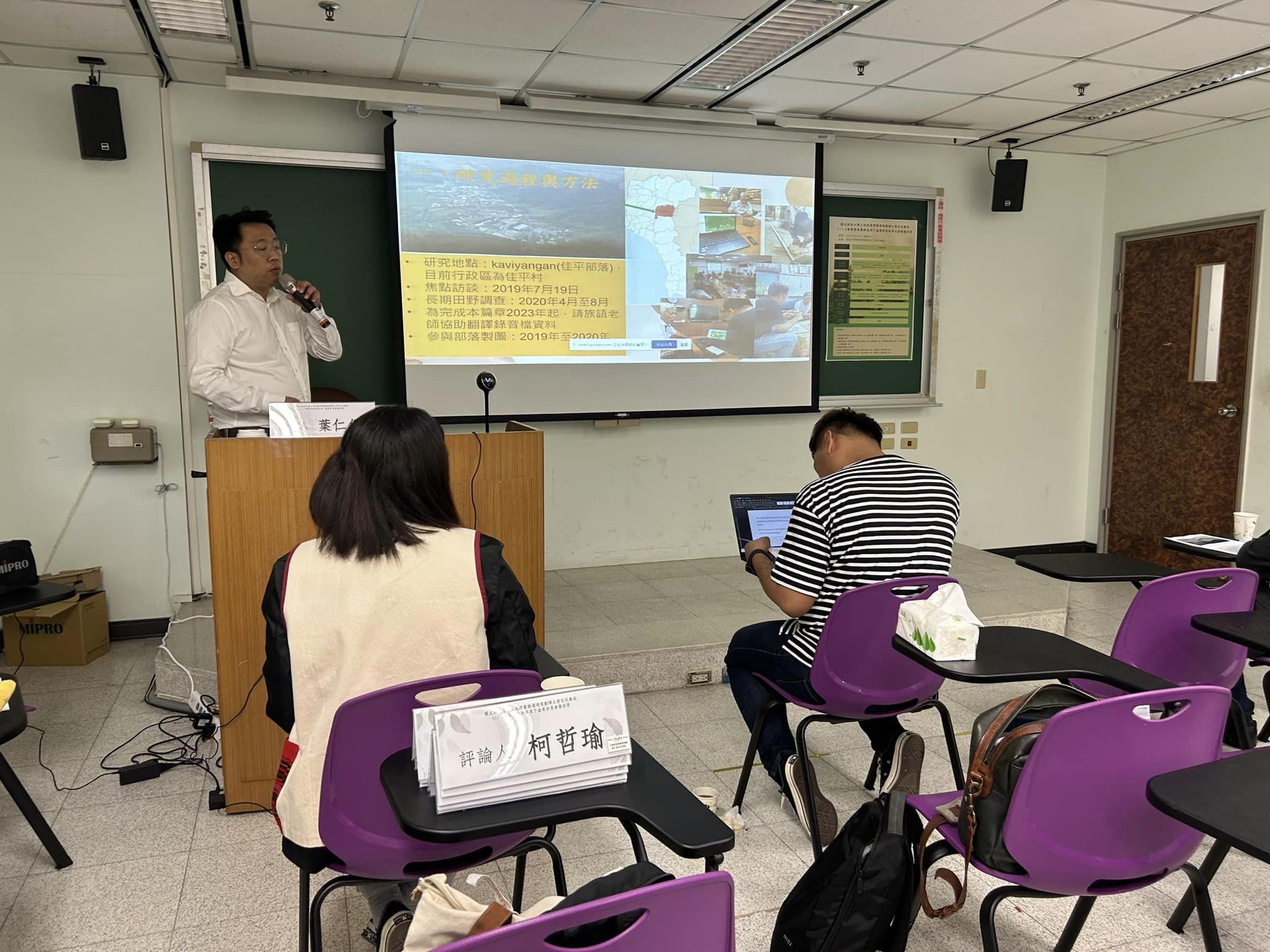 最後則是本專班的研究計畫團隊來發表,討論有關新北市烏來區土地權利的議題,由專任助理徐銘暉及本專班學生田原分享,展示豐富的研究歷程作為同學們書寫論文的參考,從問題意識開始,再從田野調查、文獻爬梳等一一找到解答與結論。