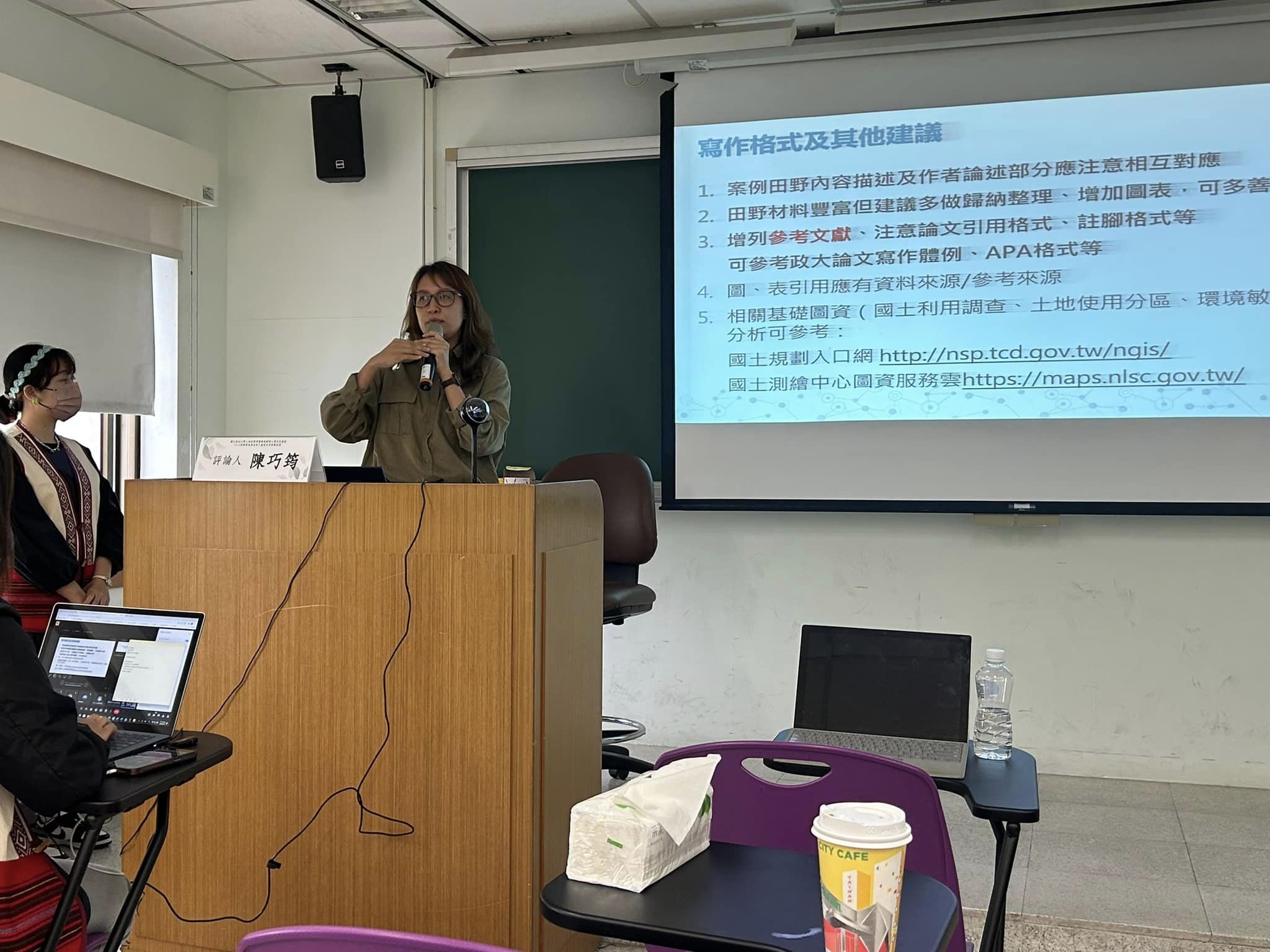 第三位是何瑞珍同學的發表,評論人由陳巧筠學姊擔任,評論的開始巧筠學姐先是讚賞瑞珍章節資料的完整度,隨後也提出想法與建議。陳巧筠學姊畢業於政大地政學系學士班、民族學系碩士班,是民族學與地政學合作之結晶,曾經服務於總統府原轉會土地小組,現在在規劃公司擔任規劃師,執行原鄉的鄉村地區整體規劃工作,是本專班經常邀請的評論人,也是學弟妹的榜樣。