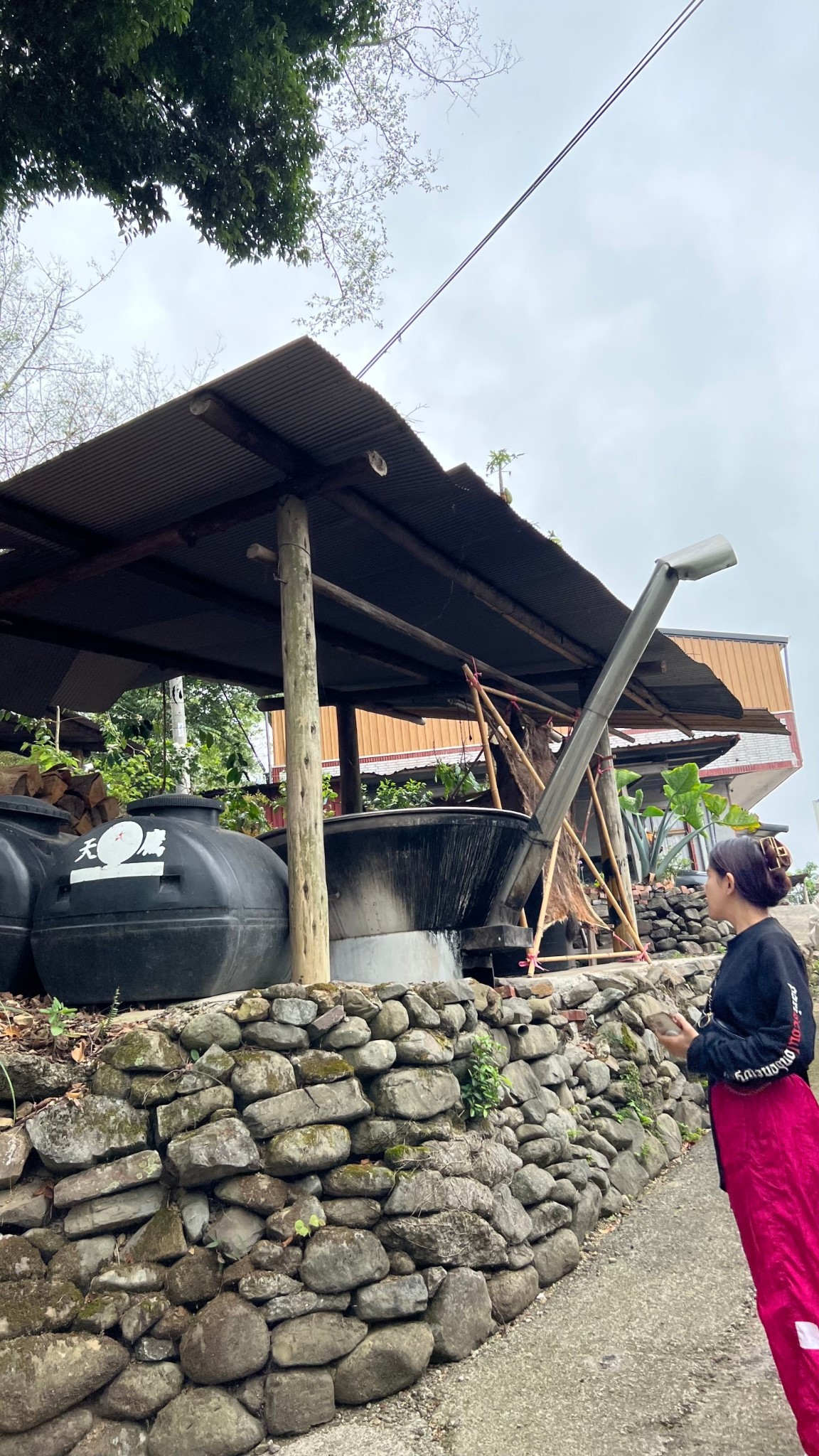 一側有個相當大的鐵製品,武大哥和大家解釋了該器具是用來處理竹筍用的,且也介紹了阿里山的四大產物,分別是愛玉、咖啡、茶葉以及竹筍,在進行部落導覽的同時,身邊也都充斥著上述的作物。
